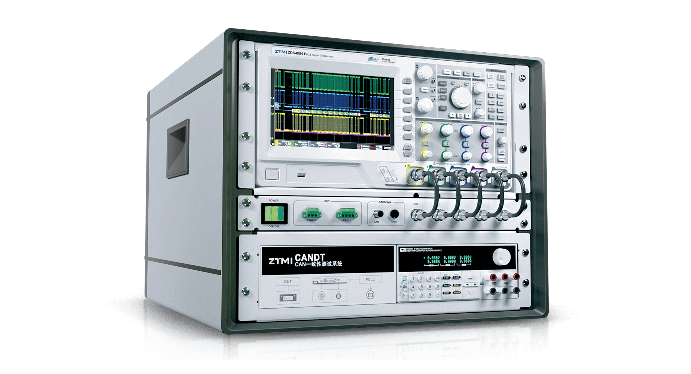 CANDT是基于CANScope強大的CAN總線底層測試分析基礎,配備必要的電壓源、PLC等核心外圍設備,可自動化完成汽車零部件CAN節點物理層、鏈路層及應用層測試的CAN一致性測試設備。物理層測試的目的是驗證節點及測試系統在電路設計、物理電平特性等方面的性能,就是保證節點能夠正確連入總線的基礎,其測試內容包括電阻電容特性、節點差分電阻、故障容錯測試、CAN線上的物理電平特性等等。數據鏈路層的測試目的是保證每個節點的通訊參數能夠保持一致性,所組成的網絡能夠正常有效的工作,內容包括位定時測試、采樣點測試、SJW測試等等。
