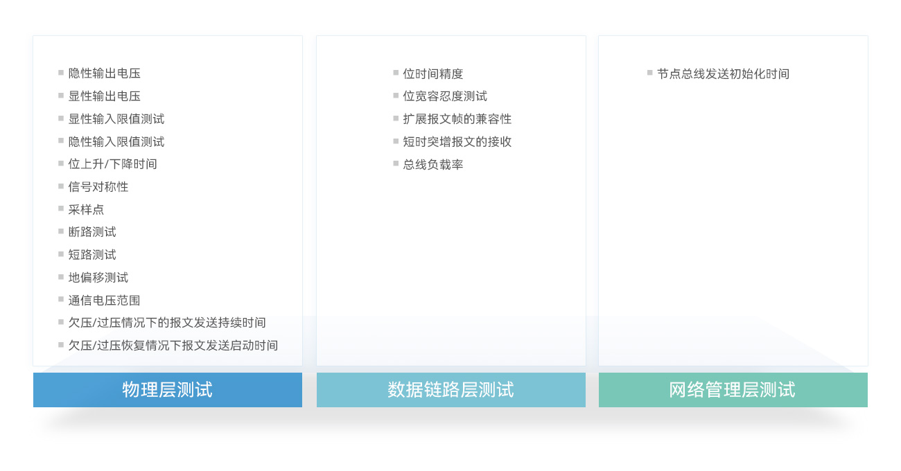 CAN一致性測試系統以ISO11898標準為核心,圍繞國內主流新能源主機廠CAN總線測試標準為主要依據,測試功能滿足物理層、鏈路層、應用層的測試需求。