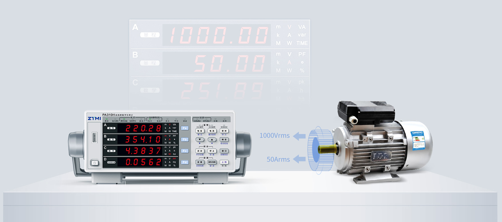PA310H功率計配備單通道1000V/50A功率板卡,具備0.1%高精度與300KHz高帶寬。