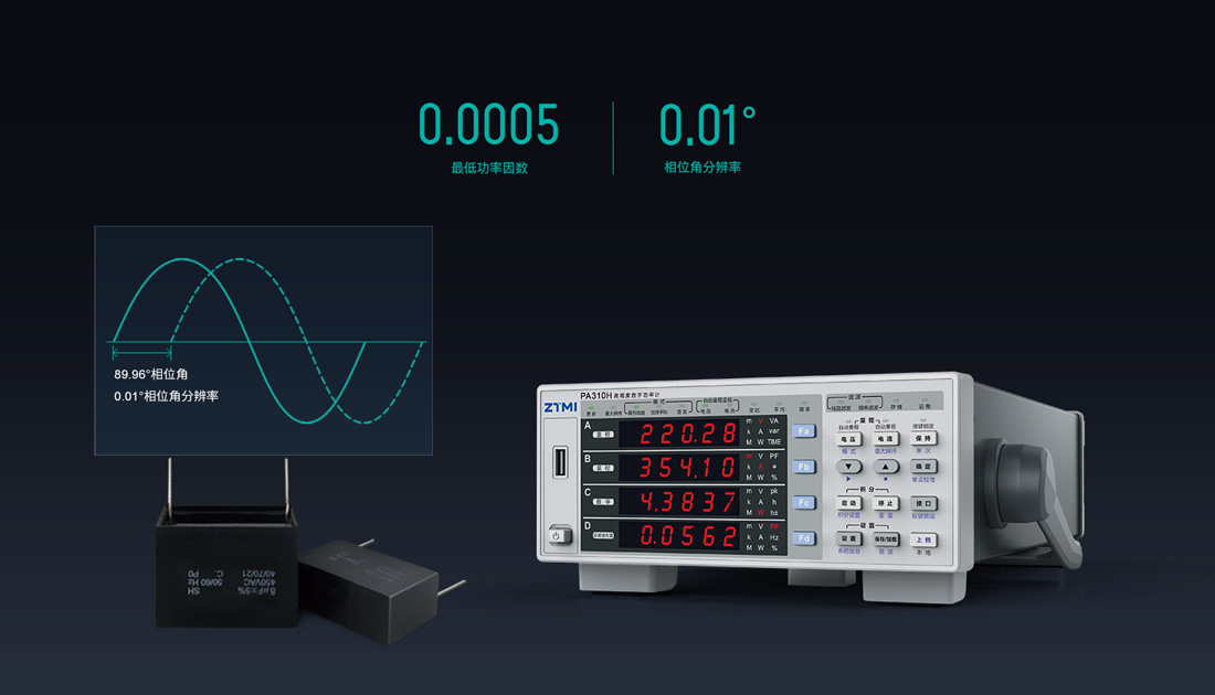PA300系列數字功率計采用100MHz同步時鐘,相角分辨率高達0.01°。即使在低至0.0005的功率因數下仍能保證0.1%的高測量精度。