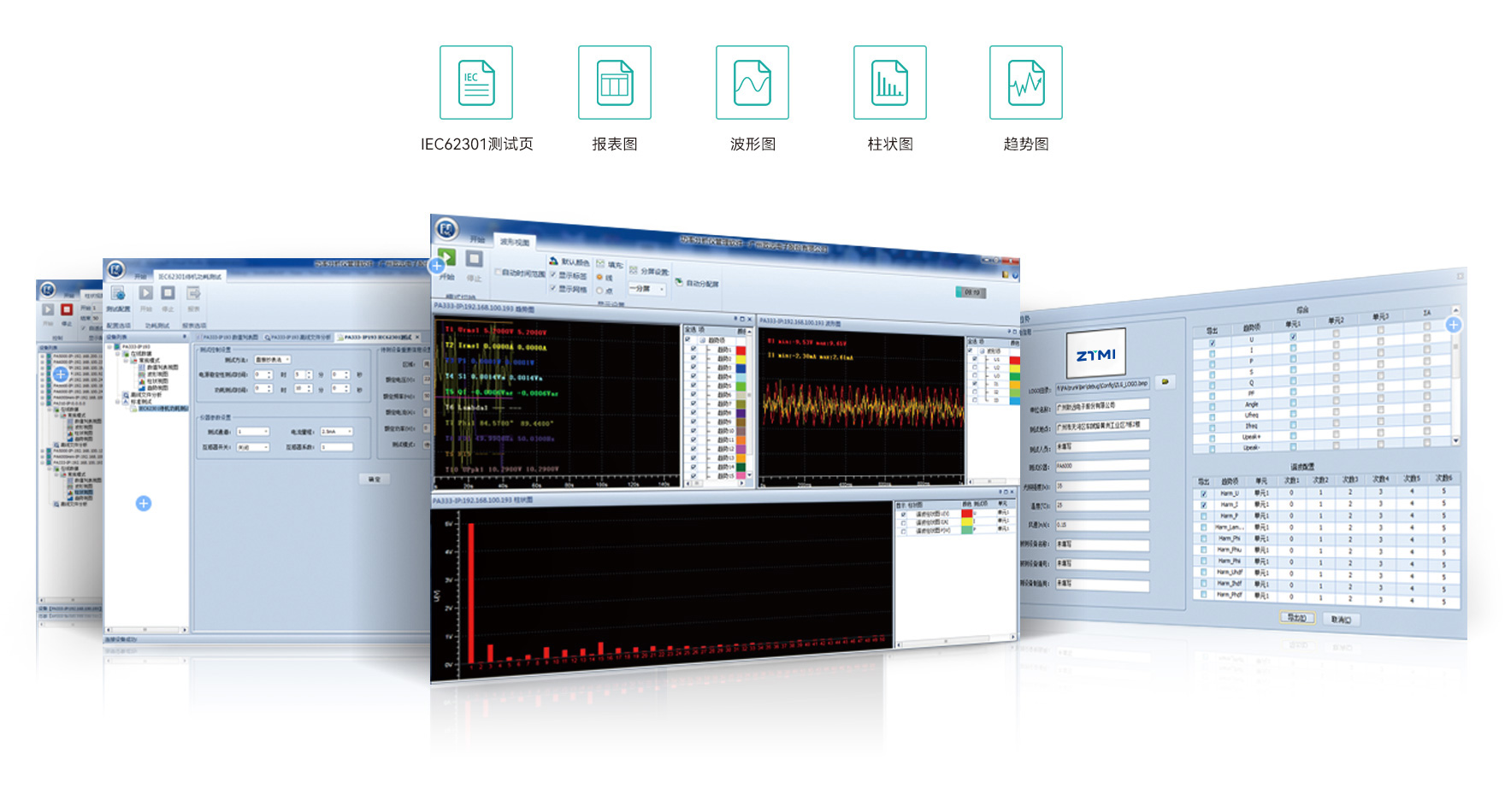 PAM管理軟件具有強大的數據處理分析功能,支持對所有測量參數數值進行實時顯示,生成各次諧波數據、諧波柱狀圖、趨勢圖和波形圖,支持同步顯示與報表導出。支持IEC62301國際測試標準,實現待機功耗的自動化測試。