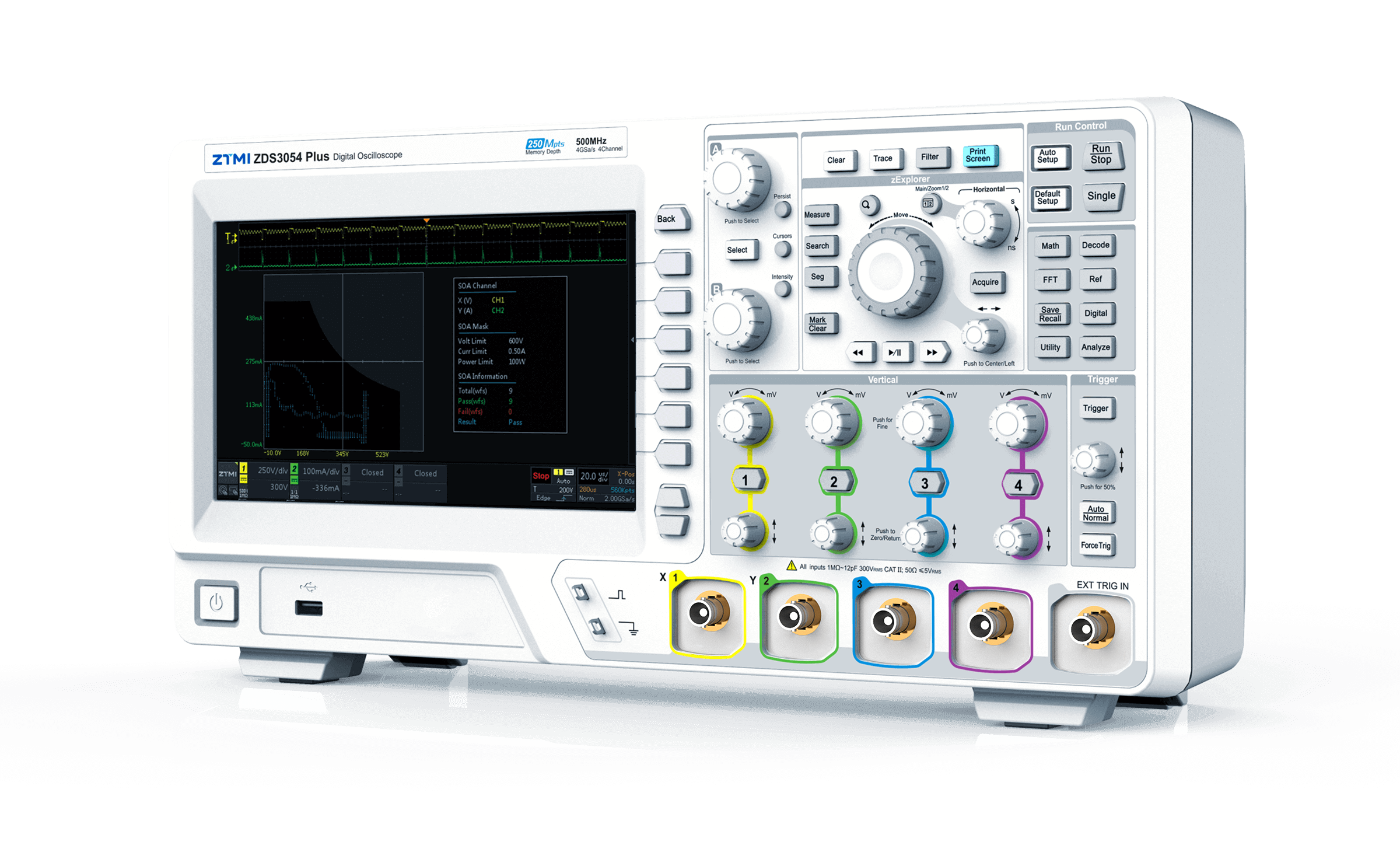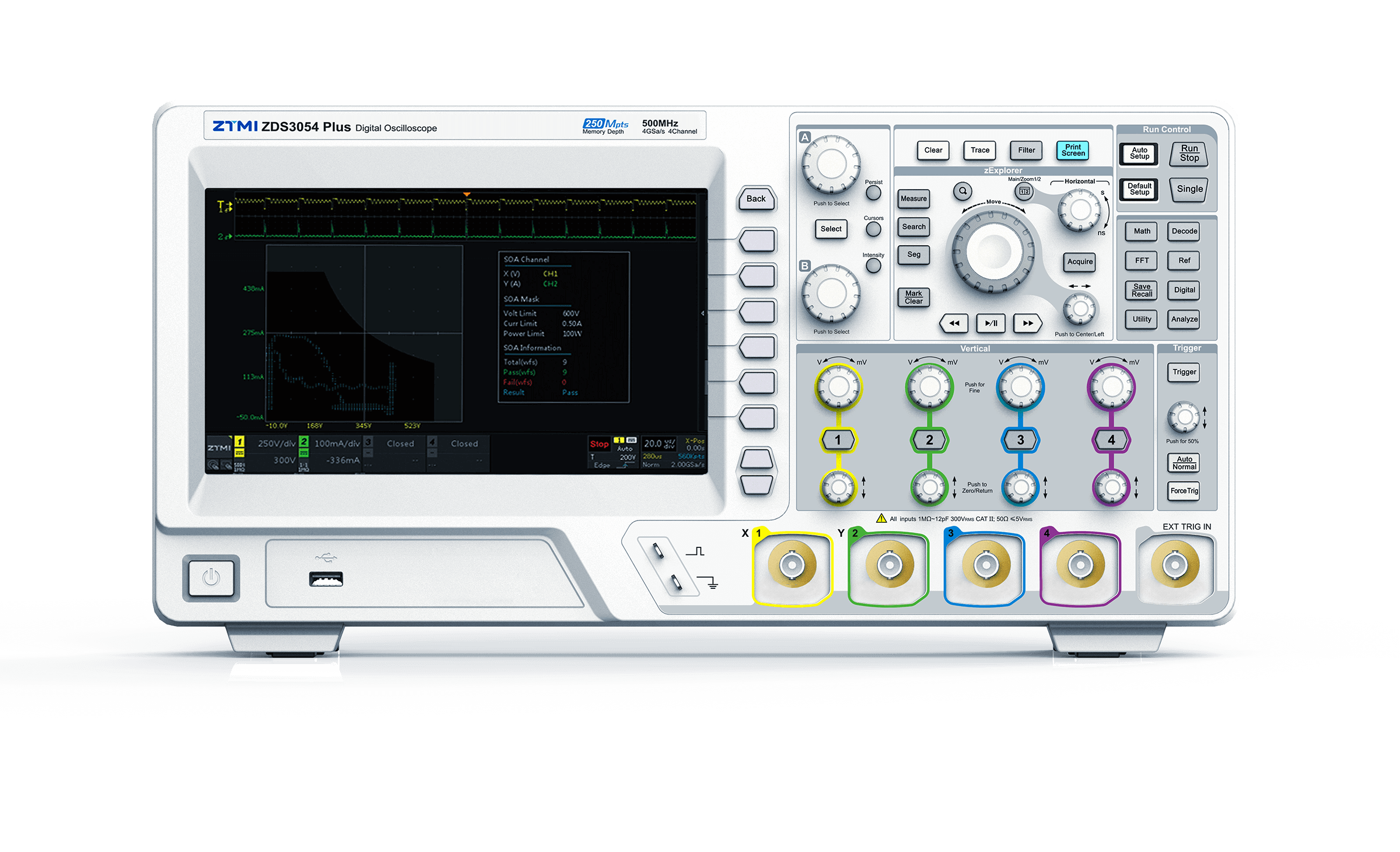 開關器件長期承受較大功耗,一但過壓或過流就可能會導致器件損壞甚至爆炸。雖然器件手冊中明確標注了IDM和VDS各項參數,但常規調試手段無法對器件的整個工作周期進行評估。通過ZDS3024定制的SOA安全工作區測量功能,可以準確評估整個工作周期內開關器件的所有狀態,明確給出電源超出安全工作區的異常概率,便于工程師更好的評估電源工作穩定性。