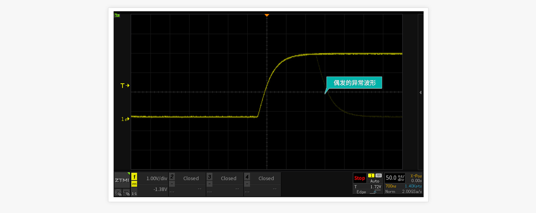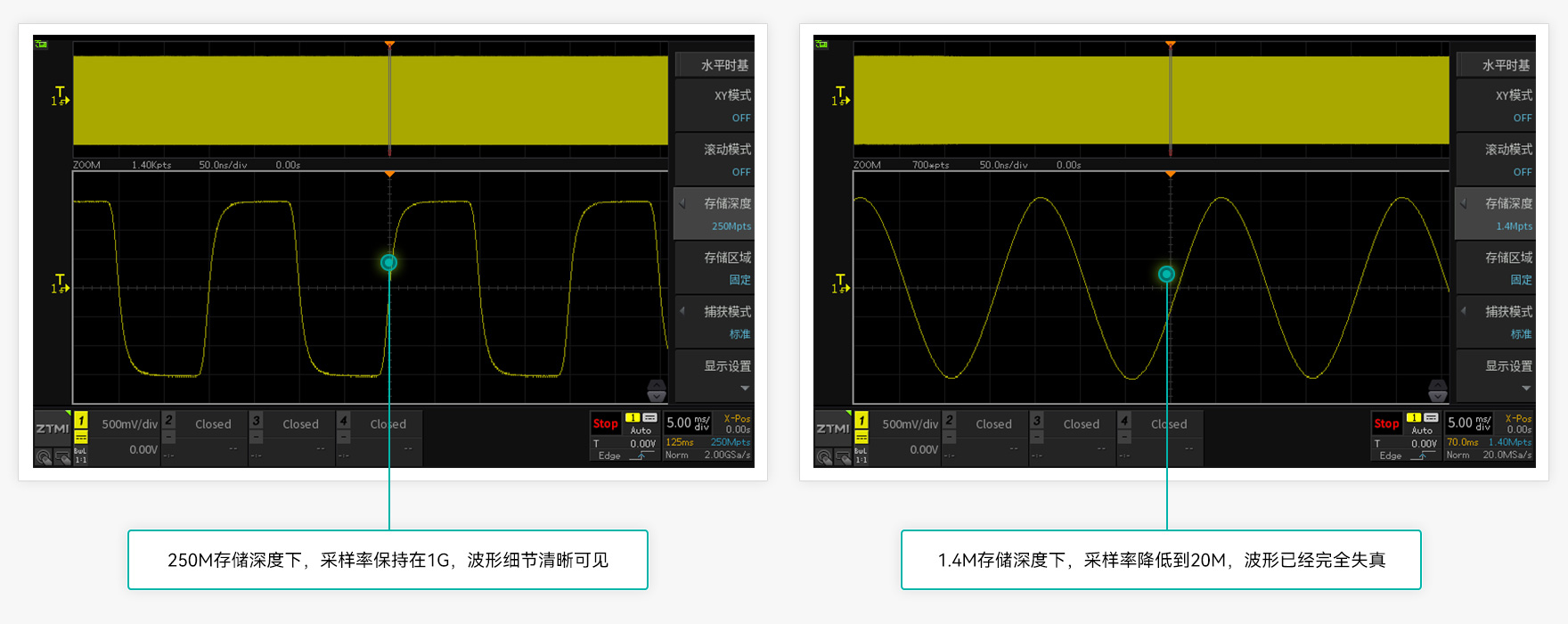 如果存儲深度能夠做到足夠大,就能保持較高的波形采樣率,則觀察到的波形會更加真實、細膩。反之,如果存儲深度只有1Mpts甚至更低,當要觀察時長較大的波形時,示波器就只能被迫降低采樣率。由于采樣點數不足,示波器顯示的波形也會嚴重失真,甚至產生波形混疊,誤導用戶測量分析。ZDS3000/2000B系列示波器創新性地采用DDR3存儲技術,配合大規模的FPGA器件,通過全硬件加速和多線程并行處理,存儲深度最高可達250M !在觀察長時間波形時也不丟失波形細節。