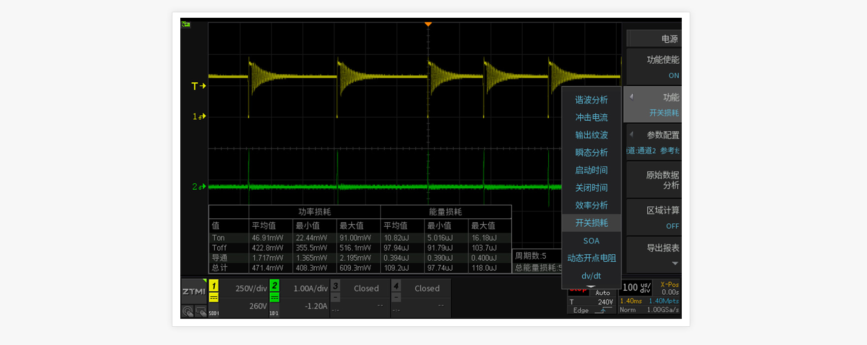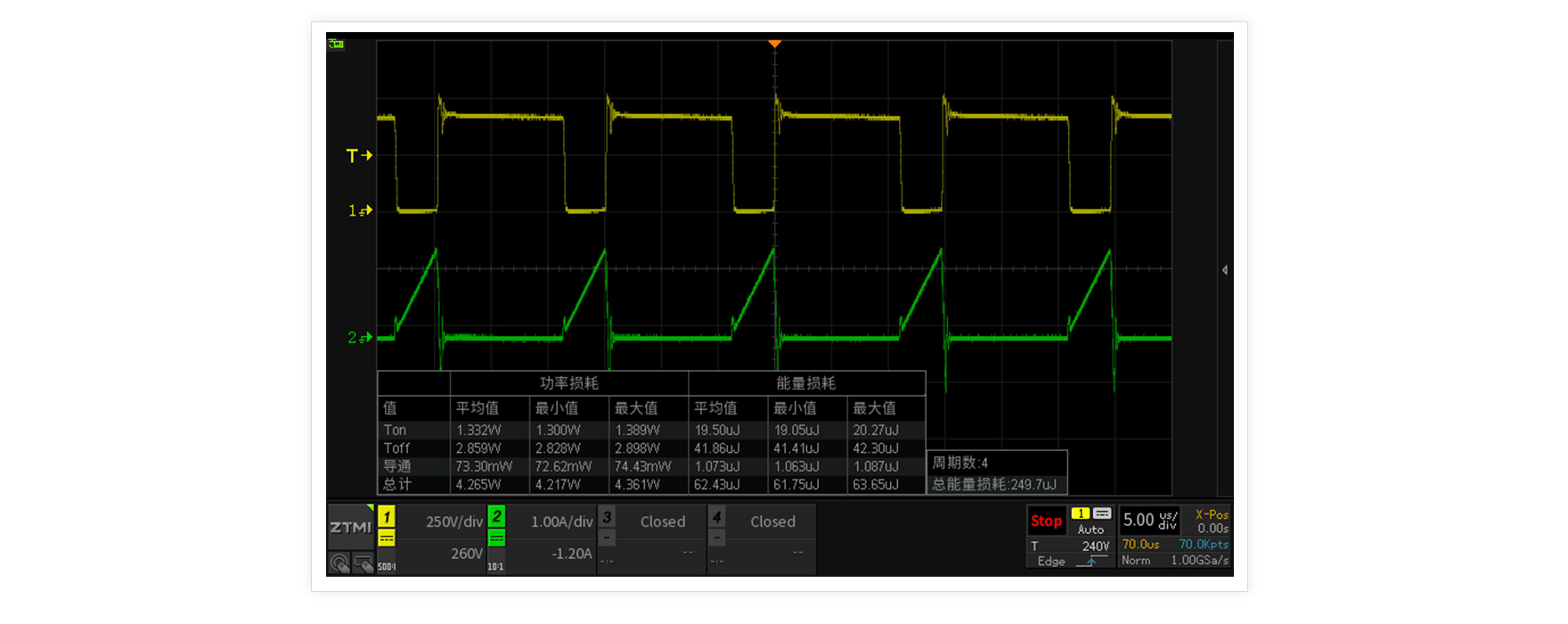 PFC MOS管開關損耗測試是電源調試中的難點,由于不同周期的電壓和電流波形都不相同,功率損耗的準確評估也更依賴長時間高采樣率的波形捕獲,因此存儲深度和功率損耗運算原始點數成為開關損耗準確與否的關鍵。ZDS3024示波器標配250M存儲深度,并通過全硬件加速處理優化,可精準量化開關器件的功率損耗。