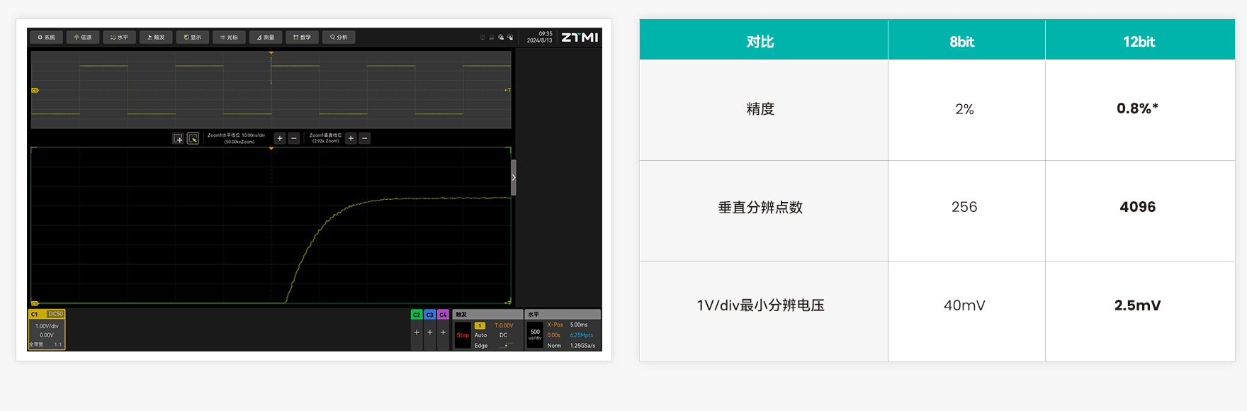 示波器的ADC 位數越高,波形的垂直分辨率就可以越細,就可以看到更多的波形細節。ZUS6000 采用12bit 高速ADC,垂直分辨點數達到4096點,測量精度達到0.8%,可以精準地觀察到更微小的波形變化。