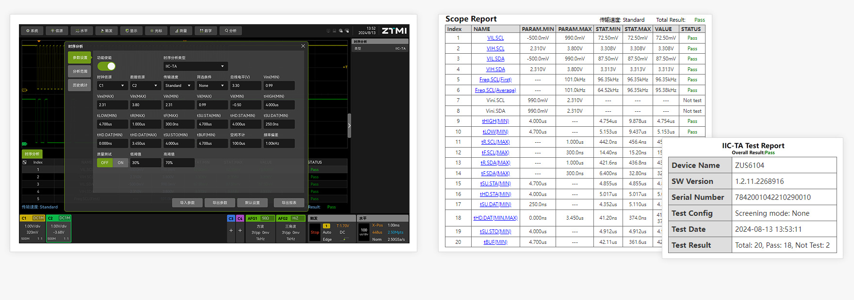手機、智能穿戴、家電、多媒體影音、汽車電子配件等智能設備,對于內部總線通信時序一致性有嚴格要求。ZUS6000創新的時序分析功能,可分析IIC、IIS、SPI、MIPI-RFFE等信號的脈寬、幅值、邊沿、建立時間、保持時間等參數,并導出測試一致性報告。